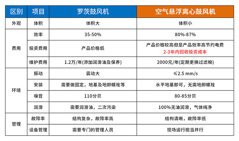 高效率:與羅茨鼓風(fēng)機比較,懸浮鼓風(fēng)機效率提高30%以上